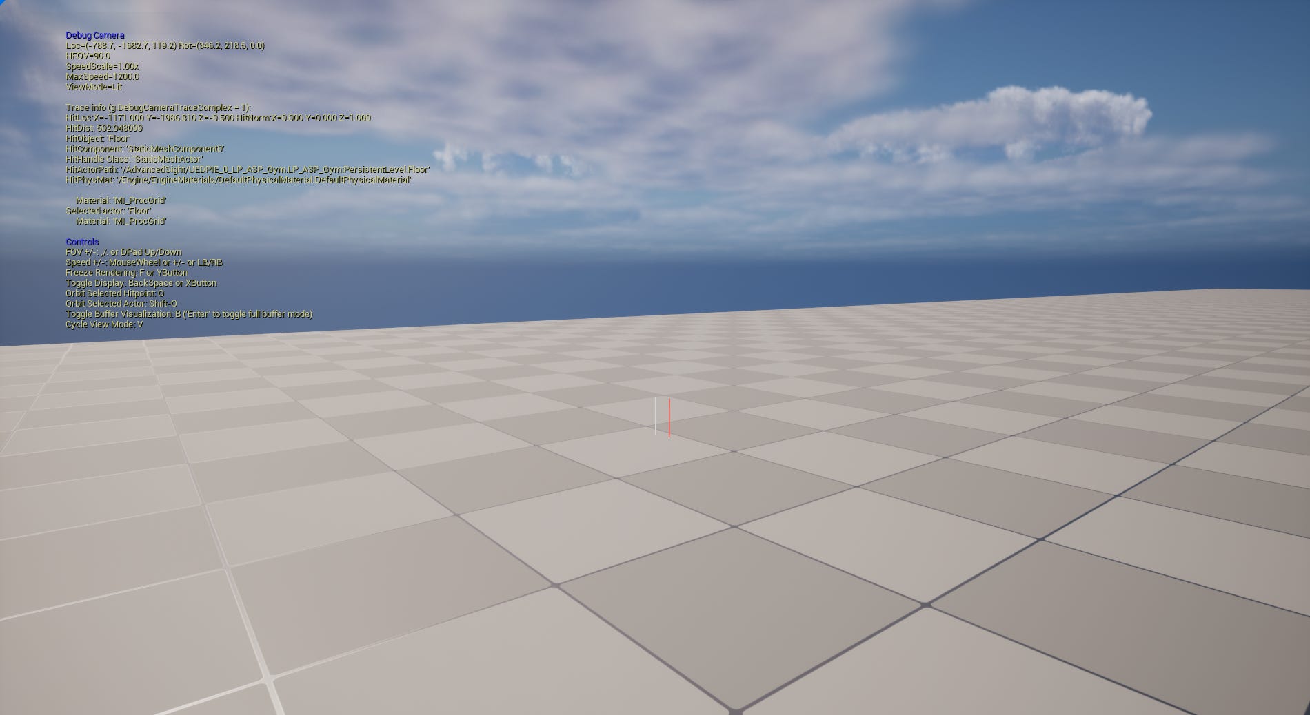 If you find yourself in a situation where you play game and would like to eject from the player controller to inspect something on the level, worry not. You can toggle the Debug Camera by pressing ; key. It allows you to roam around the level freely without any collisions. Additionally, it displays useful information and is interactive. You can use LMB to fire a line trace. The information about hit object will be displayed there. It also shows some useful shortcuts for manipulating FOV, Speed, Freezing Rendering, Orbiting, Cycling View Modes etc.