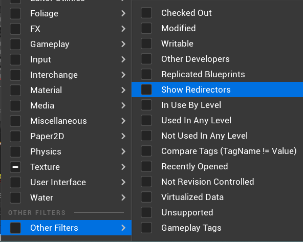 There are also some filters that you have to enable in order to see assets that are hidden by default. One example of such asset is asset redirector. Asset redirector is an asset created automatically when you move an existing asset to a different folder or when you rename it. You can resolve it and remove, but you can only do this when you can see it. See below on how to make it visible.