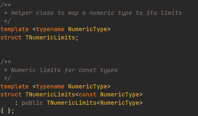 The structure mentioned in the topic of this post is TNumericLimits<typename NumericType> and can be found in NumericLimits.h file. Subclasses of this structure implement different template parameters like uint8 or int32. They all contain same set of constexpr functions: